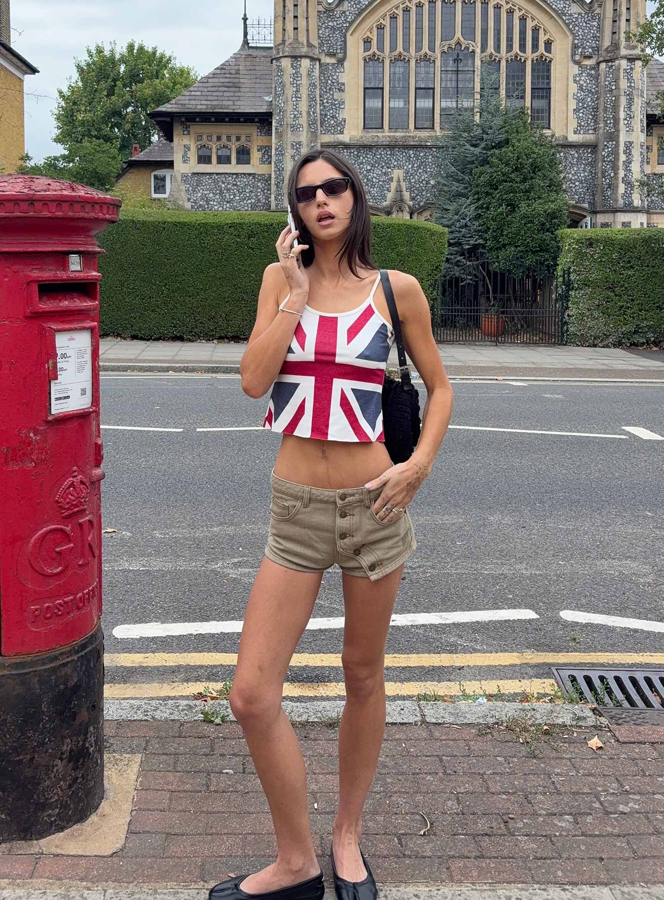 - Scoop neckline, washed-like print detail, raw edge hem, thin fixed straps, crop