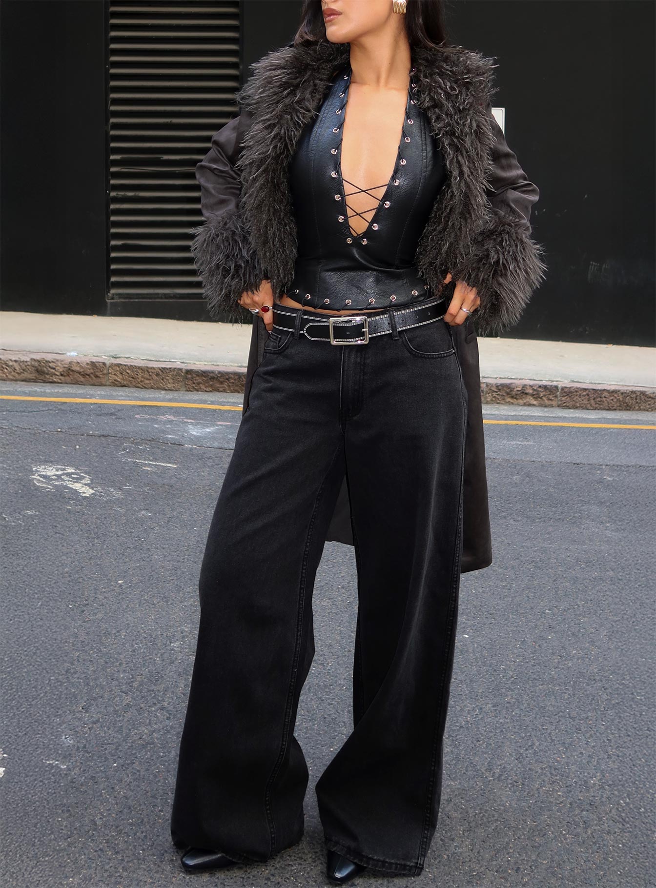 - Washed black, belt looped waist, button & zip closure, five pockets, branded patch at back